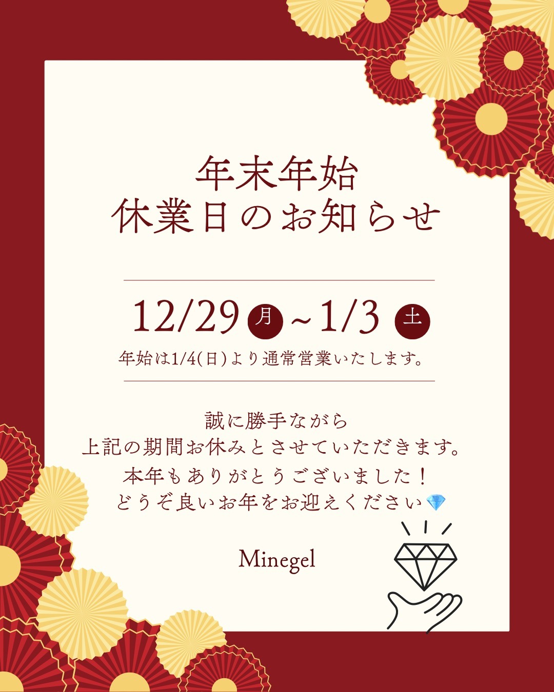 年末年始のお休みをいただきます🙏