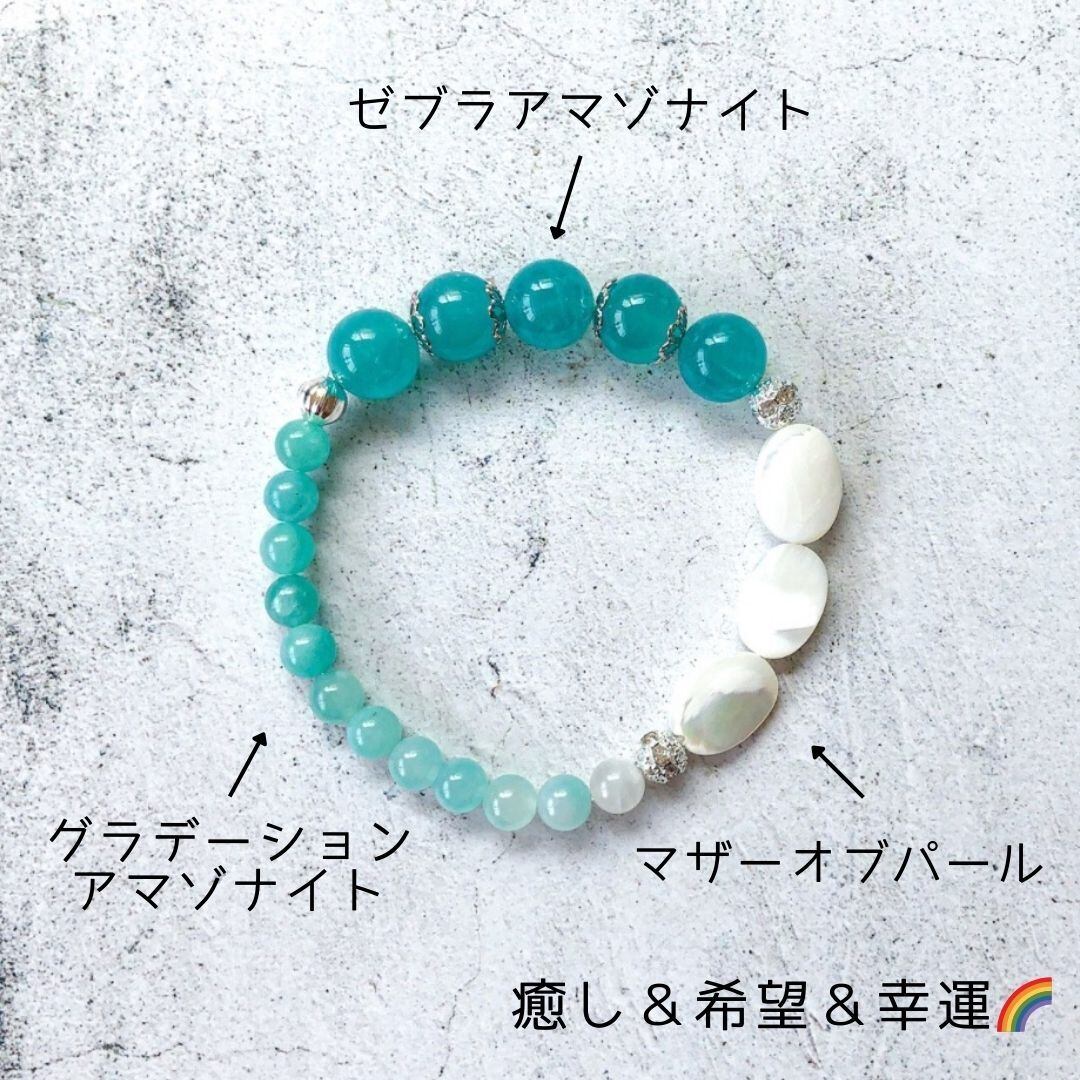 希少なロシア産のゼブラアマゾナイトにグラデーションが目を惹くアマゾナイトとマザーオブパールの爽やかなデザインブレスレット♪