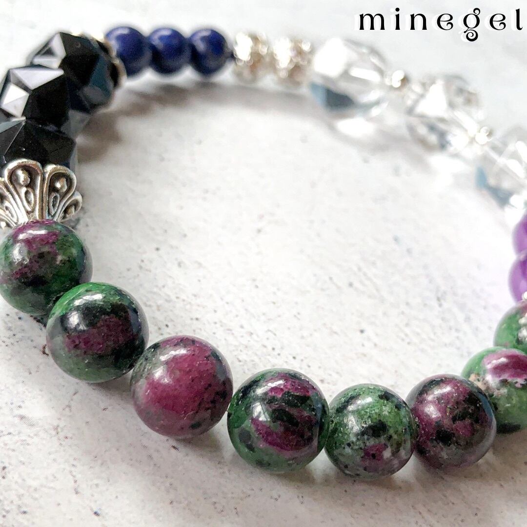 魔除け効果抜群の黒水晶モリオンとルビーが共生したゾイサイト、相性の良いラピスラズリとキラキラ水晶のブレスレット♪