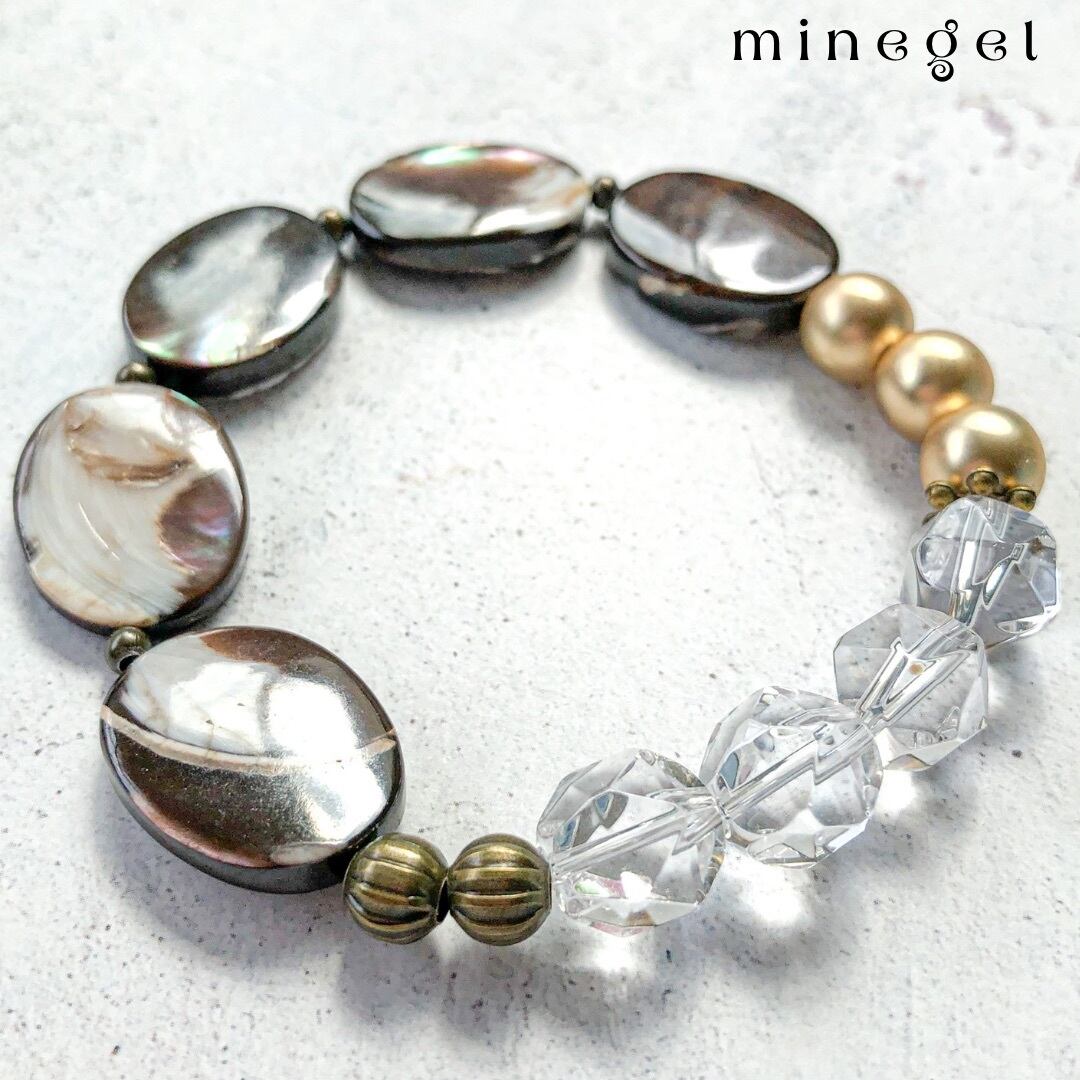目を惹く艶感のある大きめマザーオブパール(白蝶貝)にキラキラなスターカット水晶とゴールドマット加工のヘマタイトの組み合わせがカッコ良く可愛いブレスレット♪