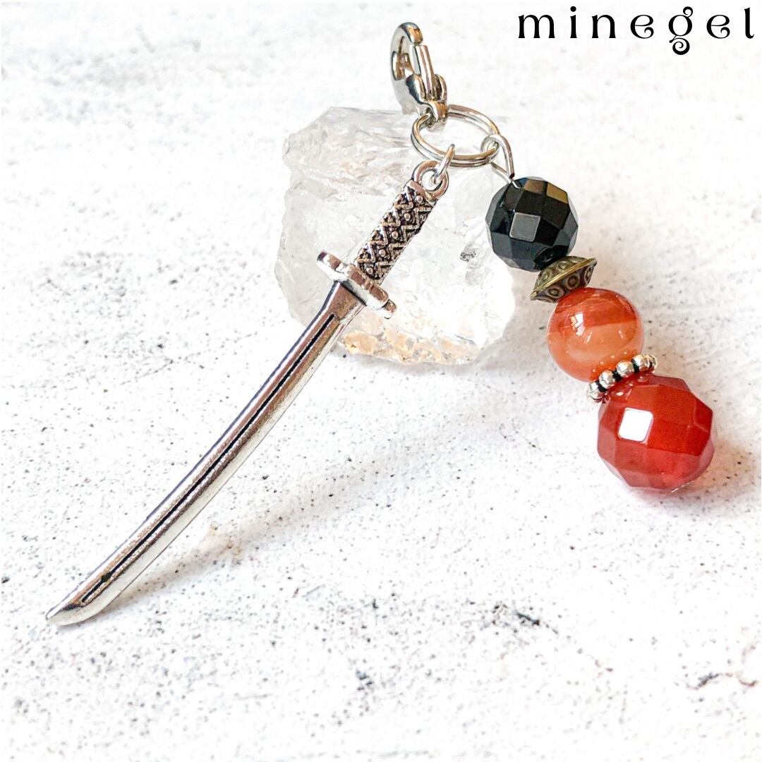 多面カットカーネリアンと炎の模様のようなサードオニキス、隊服をイメージしたブラックオニキスをつなげたチャームです✨