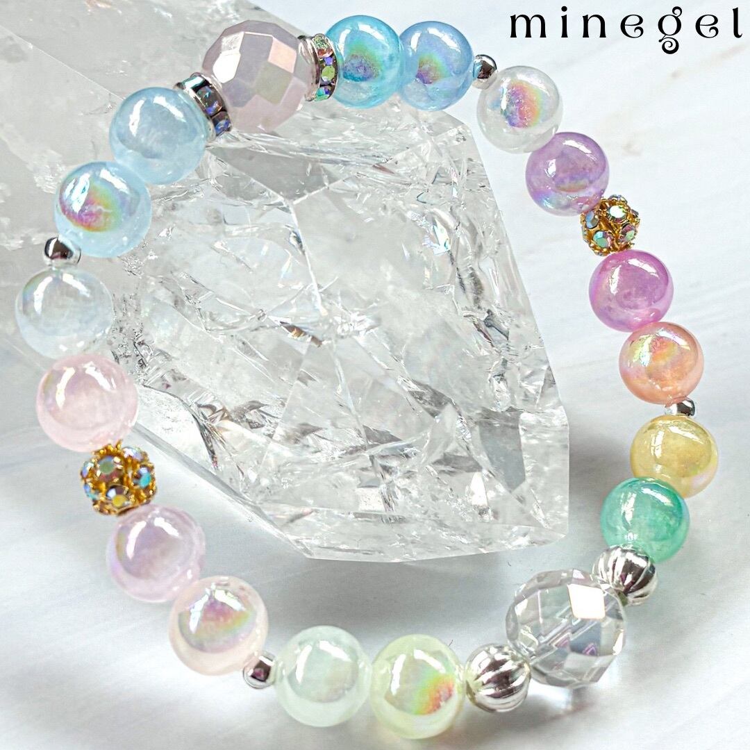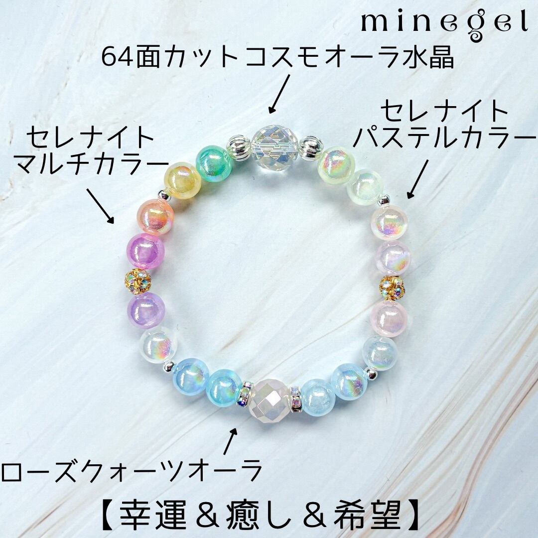 ローズクォーツオーラ、パステルカラーとマルチカラーの可愛いキャッツアイセレナイト、キラキラな64面カットコスモオーラ水晶をあしらった心ときめくパワーストーンブレスレット✩.*˚♬.*゚