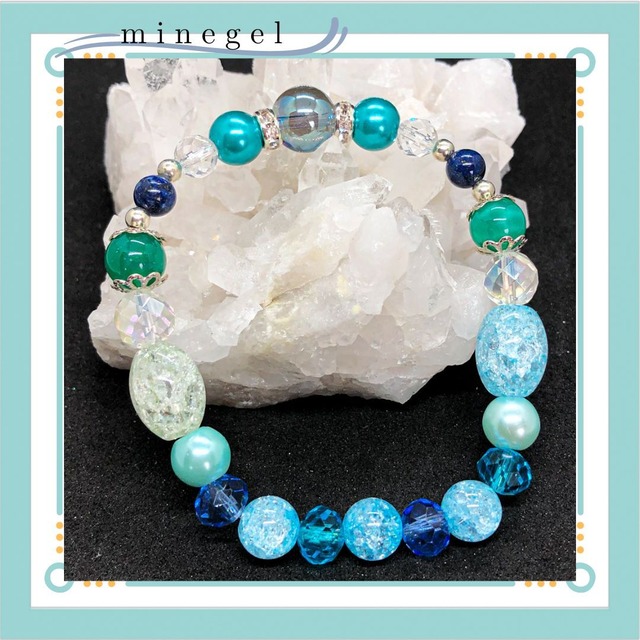 ブルーアクアオーラ水晶をメインに置き、ラピスラズリ&ドラゴングリーンアゲート& 64面カットコスモオーラ&ミニ天珠型水晶をアクセントにして、クラック水晶やボタンカット水晶&ガラスパールなどを配置良く飾りました♪