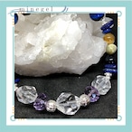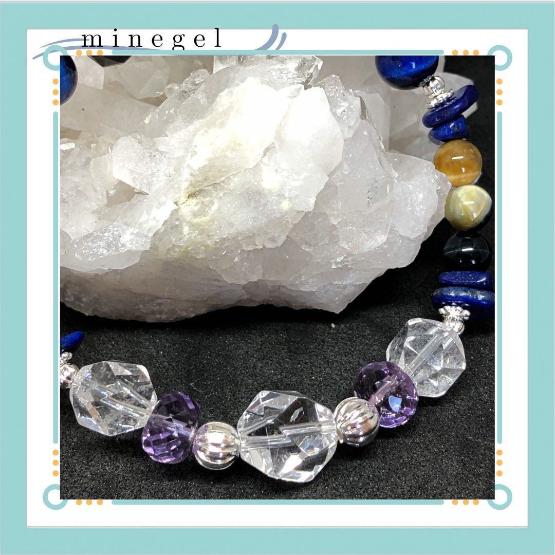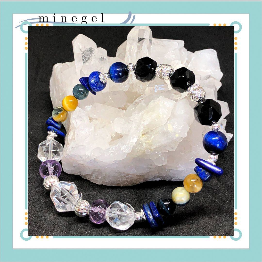 ツヤの美しいAAAA黒水晶スターカットと20面キラキラカットの水晶をメインに置き、とラピスカラーのタイガーアイ、宝石品質の多面カットアメジスト、2色のカラーが入ったツートンタイガーアイ&幸運のラピスラズリのさざれ石でカッコ良くおしゃれに仕上げました(* ᴗ͈ˬᴗ͈)”