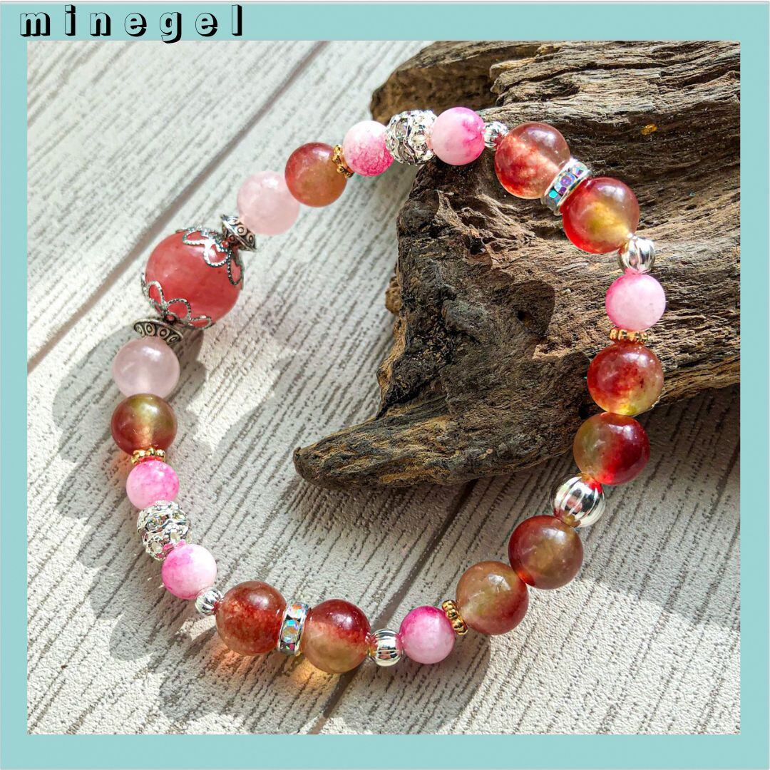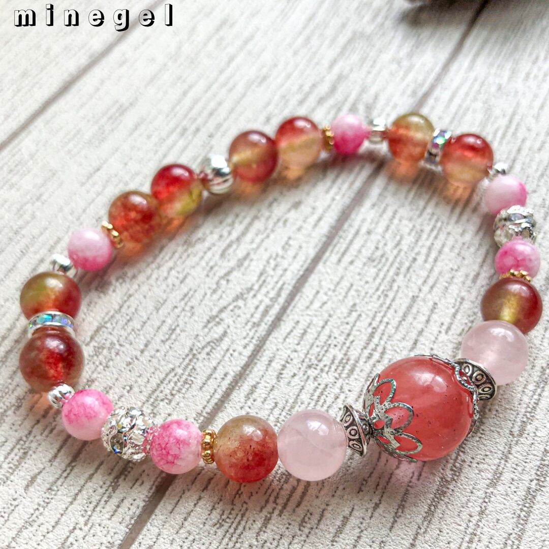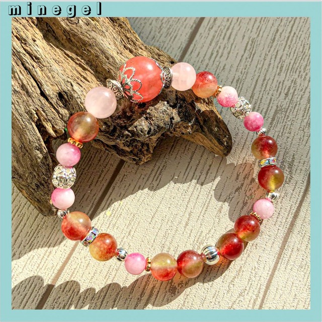 12mmのチェリークォーツとさくらんぼとモモみたいな可愛いクォーツァイト、ローズクォーツをあしらったおしゃれなパワーストーンブレスレット✩.*˚♬.*゚