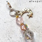 10mmの64面カットコスモオーラ水晶と多面カットハート型のローズクォーツにキラキラミラーボールカットのピンクガラスビーズとお月様&お星さまモチーフをつなげたチャームです✨