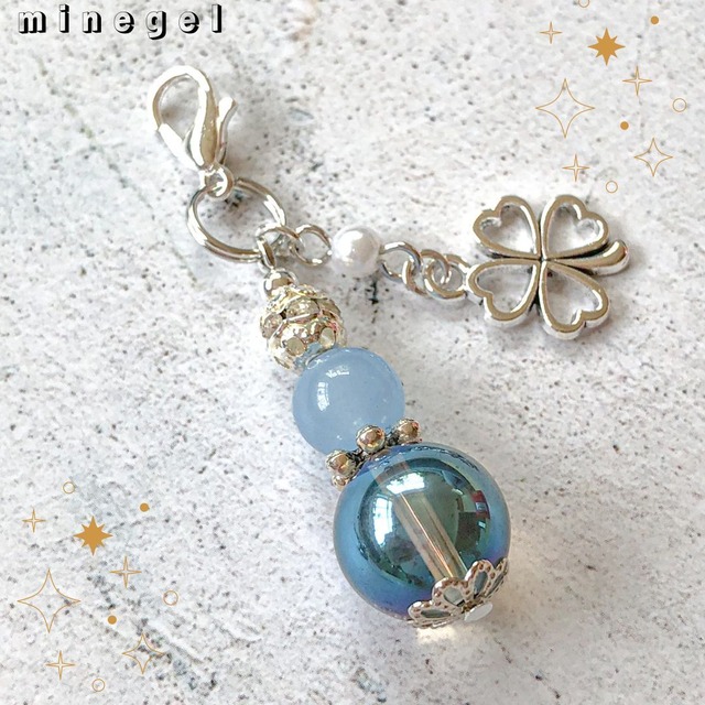 12mmブルーアクアオーラ水晶と可愛いアクアマリンにクローバーモチーフをつなげたチャームです✨
