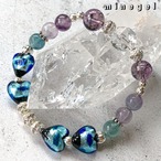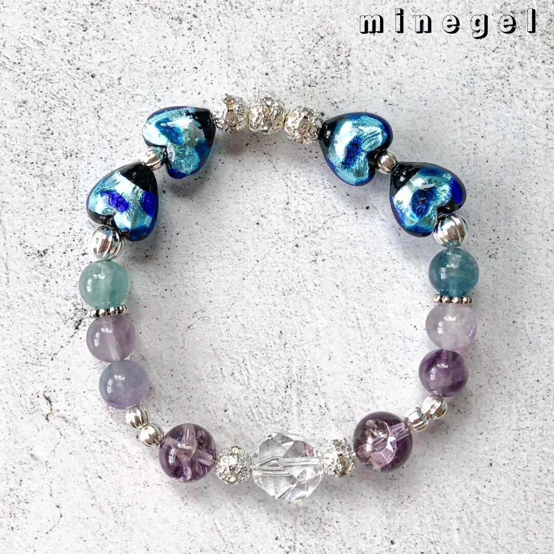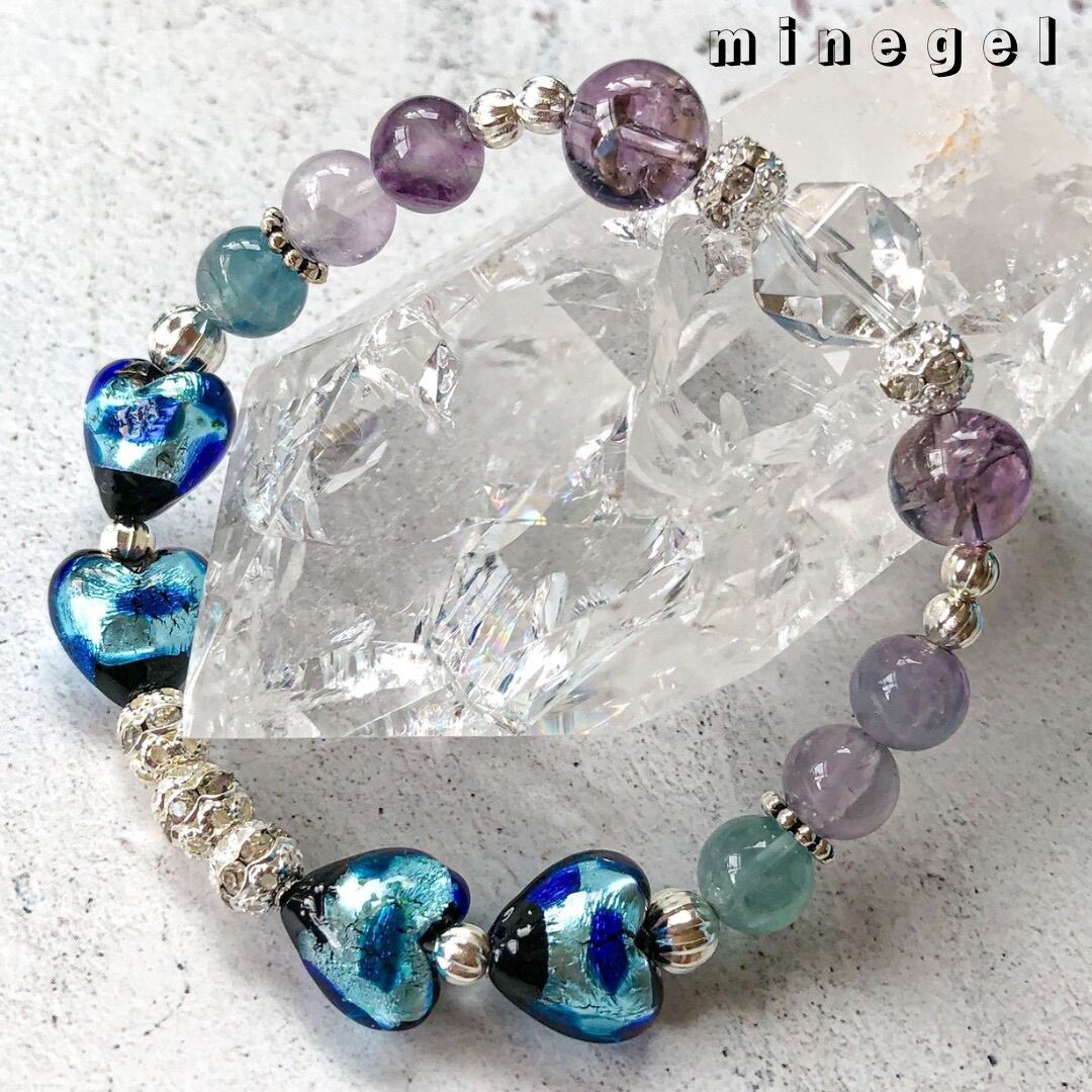 涼しげなハート型ホタルガラスとフローライト、レインボーが入ったとても神秘的なアイリスアメジストの組み合わせがおしゃれで可愛いブレスレットです(*´˘`*)♥