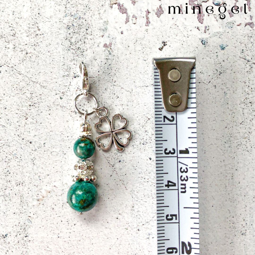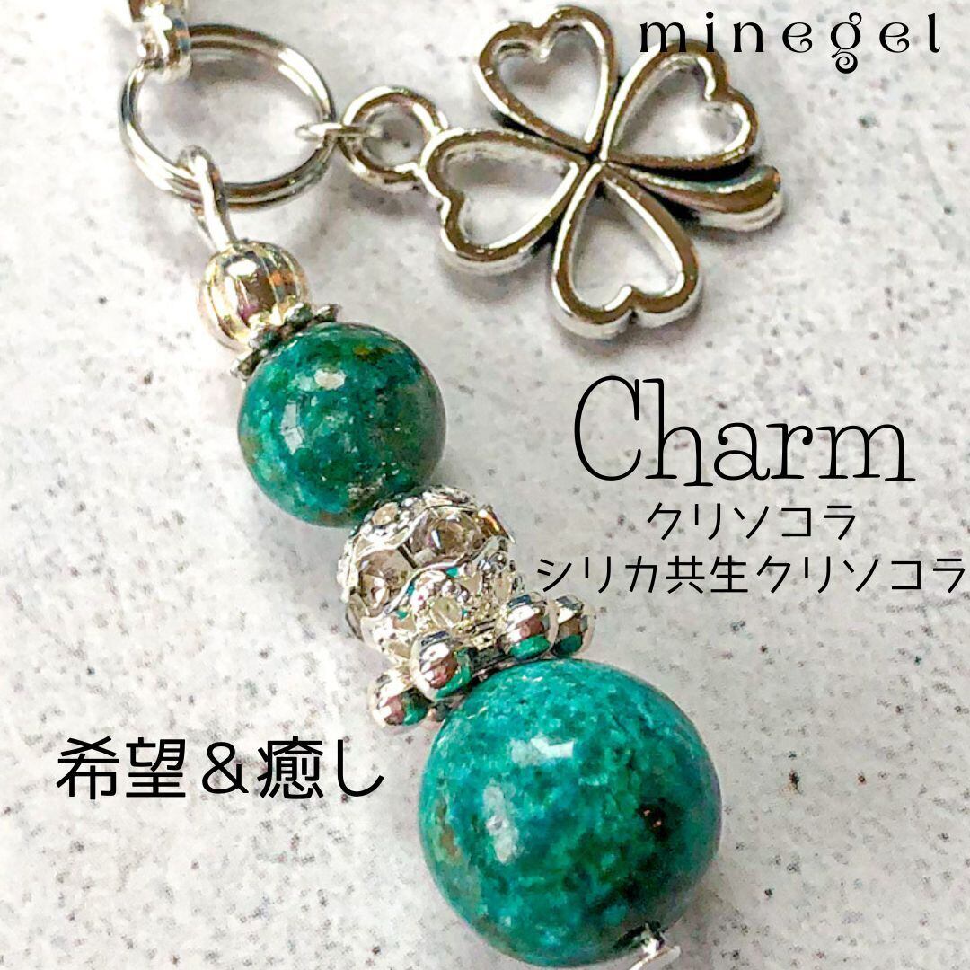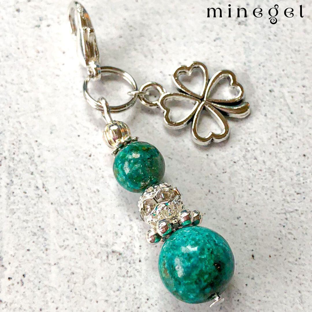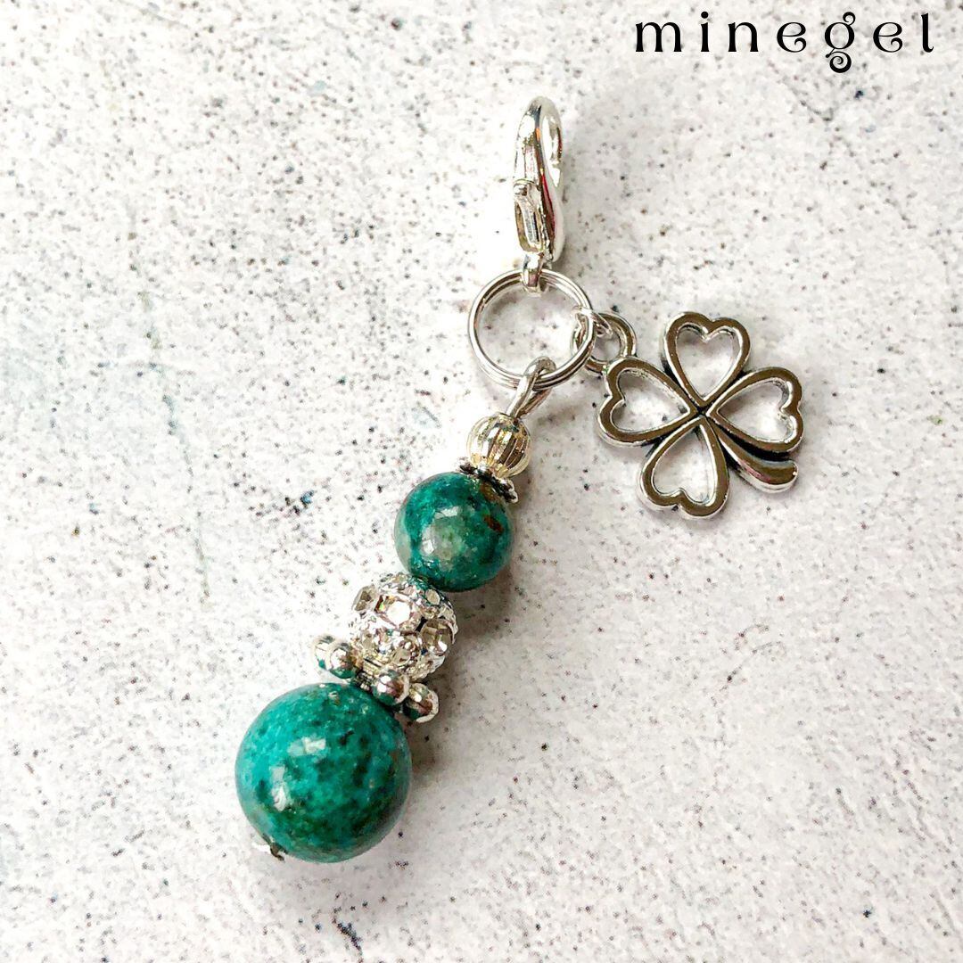 10mmの高品質なクリソコラと6mmの希少シリカ共生クリソコラに幸運の四葉のクローバーモチーフをつなげたチャームです✨
